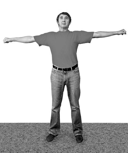Исходное положение: встаньте прямо; ноги чуть уже ширины плеч, прямые руки разведены в стороны, кисти сжаты в кулаки.