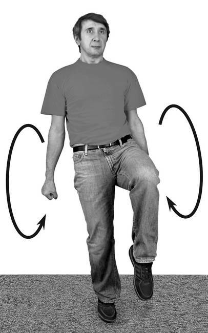 На счет «раз» выполните круговое движение обеими выпрямленными руками в направлении «вперед-вниз-назад-вверх». В момент, когда руки достигли нижнего положения, коротко и шумно вдохните носом, поднимите правое колено и одновременно чуть присядьте на левой ноге (легкое танцующее приседание). Затем вернитесь в исходное положение: опустите правое колено и выпрямите левую ногу. В это же время сделайте пассивный выдох, руки по-прежнему разведены в стороны. После этого выполните следующее круговое движение обеими руками, и в тот момент, когда руки достигнут нижнего положения, вдохните, поднимите левое колено и слегка присядьте на правой ноге – «два». На выдохе выпрямитесь. И так далее.