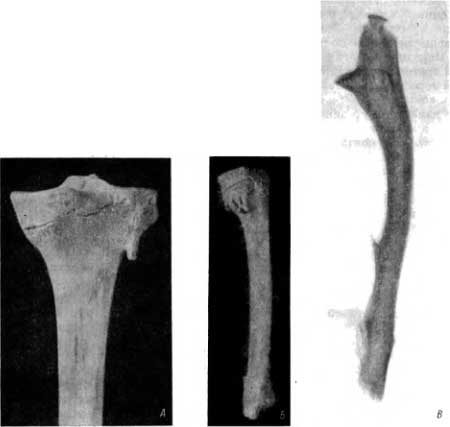 Мы наблюдали костную часть такого одиночного хрящевого экзостоза на большеберцовой кости юноши 18–20 лет из погребения X–XI в. в г. Саркеле. Рост всей кости полностью еще не закончился (рис. 57, А). Хрящевой экзостоз находится на некотором расстоянии от зоны роста. Можно считать, что он возник года за 3 до смерти. Хрящевая часть этого экзостоза разрушилась в земле. Следовательно, хрящевой экзостоз у живого юноши имел большую длину (по-видимому, вдвое большую). Как каждый хрящевой экзостоз, и этот направлен своим концом к середине кости.