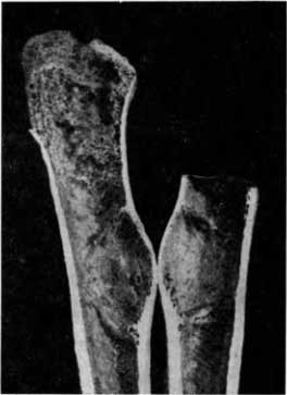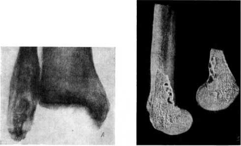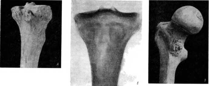 Данный костный препарат заслуживает особого внимания рентгенолога, ибо на рентгеновском снимке в задней проекции обнаруживается картина, которую можно ошибочно рассмотреть как полость, а именно — ограниченный остеомиелитический очаг — абсцесс Броди (рис. 64, Б).