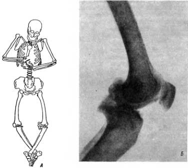 Рис. 59. А — остеохондроматоз коленного сустава (состояние скелета при вскрытии погребения); Б — остеохондроматоз коленного сустава в рентгеновском изображении.