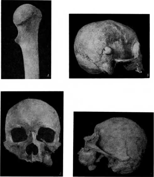 Совершенно доброкачественной опухолью кости считается остеома, т. е. опухоль, сплошь состоящая из костной ткани. Все же это — истинная опухоль, в отличие от хрящевого экзостоза, представляющего, как было указано, своеобразное проявление аномалии развития кости. Остеома довольно значительных размеров была обнаружена нами на правой плечевой кости (рис. 61, А) в погребении X–XI в. в Саркеле. Ее наружный край состоял из кортикального вещества, он прикрывал спонгиозное вещество с правильной структурой.