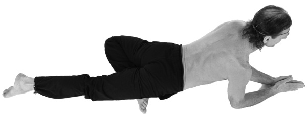 Правая стопа при этом остается на левом бедре, левая нога выпрямляется, тело опирается на согнутые в локтях руки со сложенными в молитвенном жесте ладонями.