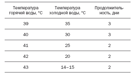 Начинать лечение надо с наименьшим различием температуры между двумя ваннами. При обычных условиях такое различие составляет 30 °C, но достигается оно постепенно, как указано ниже.