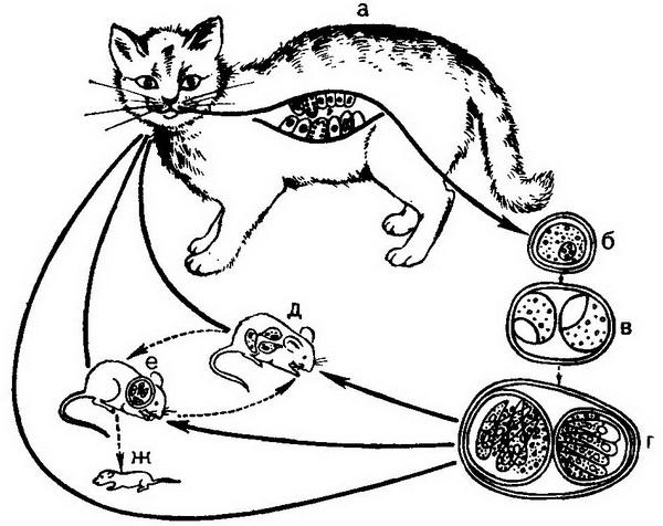Половой цикл размножения происходит в клетках слизистой оболочки кишечника кошек (основной хозяин). С испражнениями кошек выделяются ооцисты, округлые, с плотной бесцветной двухслойной оболочкой, диаметром 9–14 мкм. Ооцисты созревают и хорошо сохраняются в почве, при их заглатывании заражаются животные, в том числе грызуны (рис. 3.14).