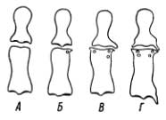 Рис. 2. Возрастные особенности в средних и концевых фалангах кисти; нарастание проявлений старения (А — Г).