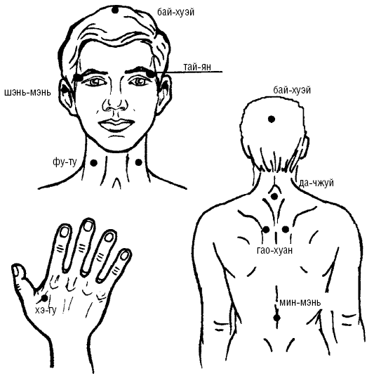 В данном случае даются рекомендации по точечному массажу при усталости, стрессовой ситуации, пониженном артериальном давлении, упадке сил, беспокойстве, головной боли, головокружении.