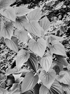 Третье растение, которое обвивало эти деревья – диоскорея. Многолетняя лиана. Есть виды: кавказская и японская. Листья напоминают по форме сердце. У диоскореи наиболее целебны корни. Главное лечебное вещество – стероидные гликозиды (сапонины), производные диосгенина, с преобладанием диосцина. Диоскорея снижает давление, уменьшает содержание сахара в крови и уровень холестерина, предупреждает приступы стенокардии, улучшает коронарный кровоток (в сердце) и зрение, снимает тахикардию, лечит атеросклероз; исчезают головная боль, шум в ушах, утомляемость. Необходима она при инфарктах, инсультах, ревматоидном артрите, подагре. Диоскорея дает исключительные результаты при атеросклерозе, как в начальной стадии, так и при выраженных формах, при кардиосклерозе, нарушениях функций гипофиза и гипоталамуса, болезнях надпочечников, яичников. Хороша для поднятия иммунитета.