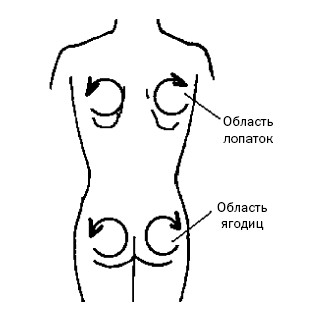 Левая рука лежит на левой лопатке, правая – на правой лопатке. При этом руки массажиста прямые, не согнутые в локтях.