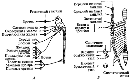 А — парасимпатический отдел; Б — симпатический отдел