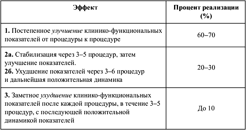 Не все спортсмены одинаково реагируют на курс или каждую процедуру. Ниже представлена таблица 1, отражающая динамику возможных исходов применения физиотерапевтических методик.