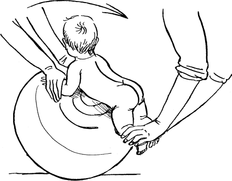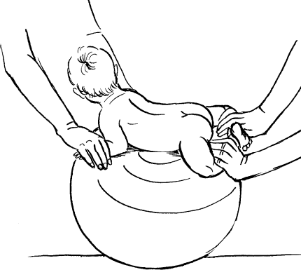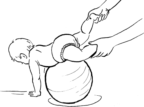 Исходное положение ребенка – лежа животом на мяче, ноги согнуты, как у лягушки, и прижаты к поверхности мяча. Ноги в таком положении один из родителей, например папа, обязательно удерживает, а другой, допустим мама, в это время встает с противоположной стороны лицом к малышу (рис. 363).