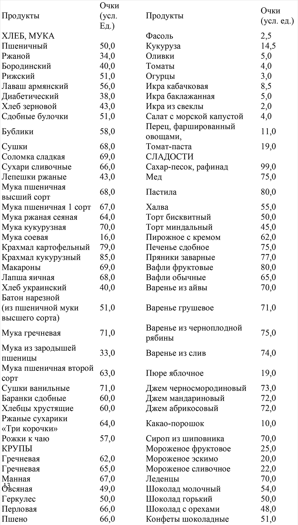 Таблица «стоимости» продуктов (в 100 г).