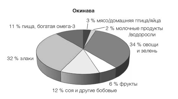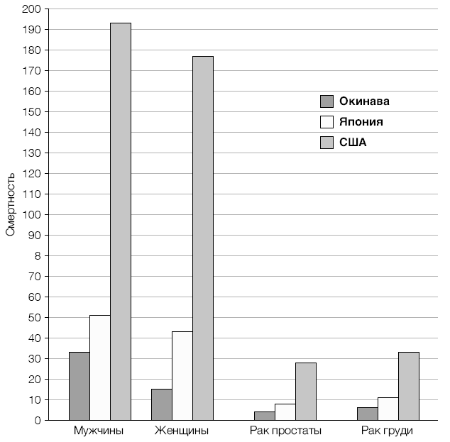 Мы видим, что в отличие от жителей Окинавы американцы потребляют в десять раз больше пищи животного происхождения и в три раза больше фруктов, но вдвое меньше овощей и зелени, втрое меньше злаков и куда меньше рыбы. На рисунке 8 показано, что у жителей Окинавы гораздо реже возникают опухоли или сердечно-сосудистые расстройства не только в сравнении с американцами, но и с японцами из других регионов.
