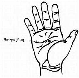 Одни точки (ворота) больше других, и это облегчает прохождение ци через них. Они играют важную роль в цигун-массаже. Это Байхуэй, Наоху, Иньтан, Минмэнь, Лаогун и Юнцюань. Наиболее важными из них являются точки Лаогун, которые расположены в центре ладоней, и точки Юнцюань, расположенные на ступнях (рис. 2-33 и 2-34).