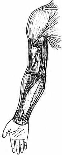 Кроме массажа нервных окончаний (например, в коже), в общем массаже существуют приемы массажа крупных нервов. В теле человека есть много мест, где можно применить эти приемы. Эти места (ворота, точки) обычно находятся на иньской стороне суставов, например, на внутренней стороне локтевого сустава (рис. 2-36), в подколенной ямке, подмышечной впадине.