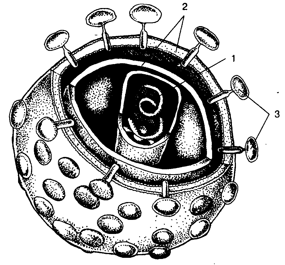 ВИЧ: 1 – РНК вируса; 2 – оболочки; 3 – белки на оболочке , связывающиеся с рецепторами на мембране клетки