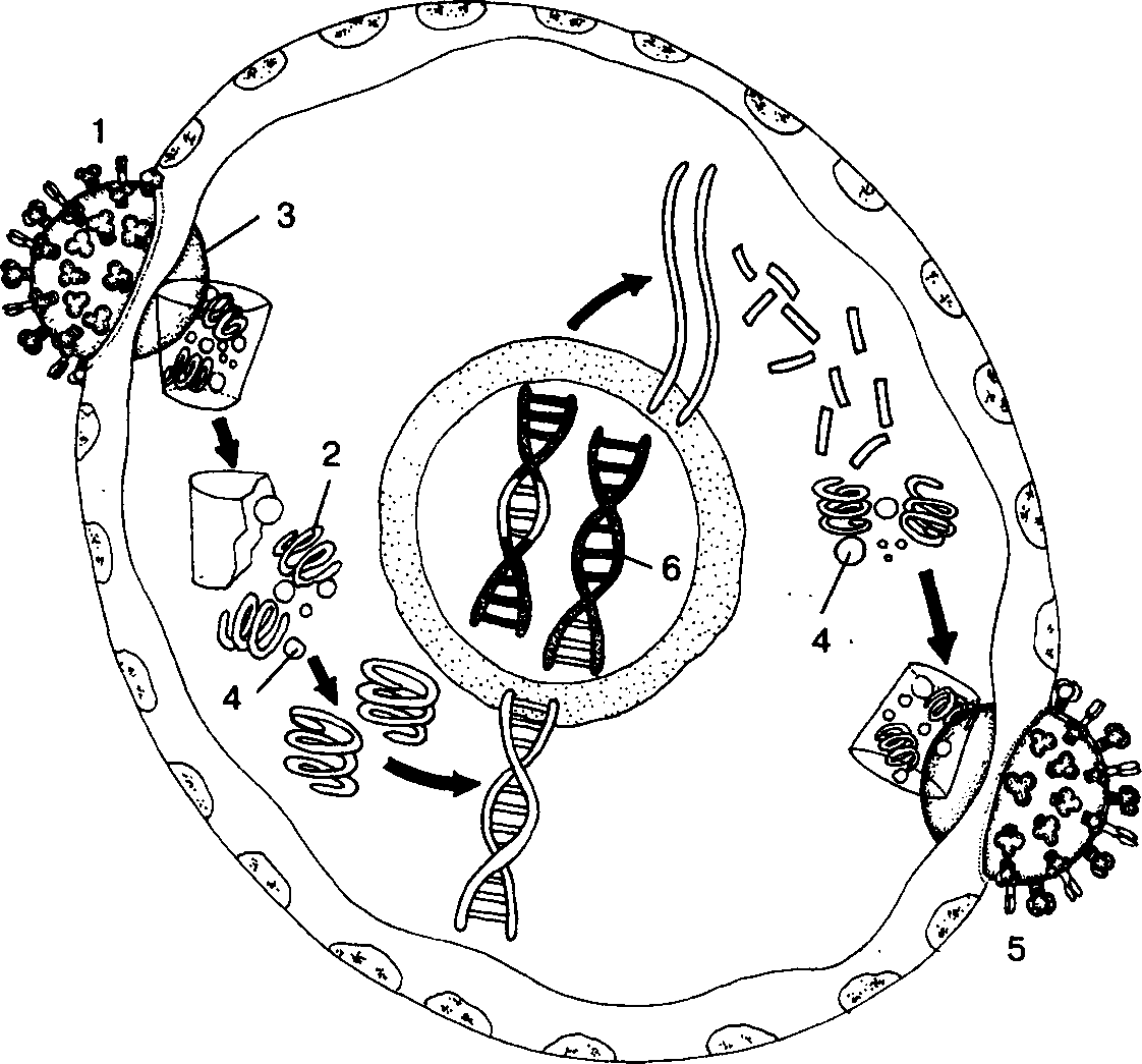 Схема развития вируса в клетке 1 – прикрепление вируса к мембране клетки–хозяина;2 – нуклеиновая кислота вируса; 3 – белковая оболочка вируса; 4 – белки вируса; 5 – готовая вирусная частица;6 – ДНК хозяина.
