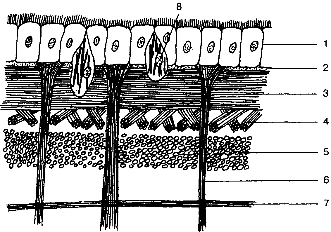 Кожно–мускульный мешок плоских червей (срез): 1 – ресничный эпителий; 2 – базальная мембрана; 3 – кольцевые мышцы; 4 – диагональные мышцы; 5 – продольные мышцы; 6 – пучки спинно–брюшных мышечных волокон; 7 – поперечные паренхимные мышечные волокна; 8 – рабдитные клетки в эпителии