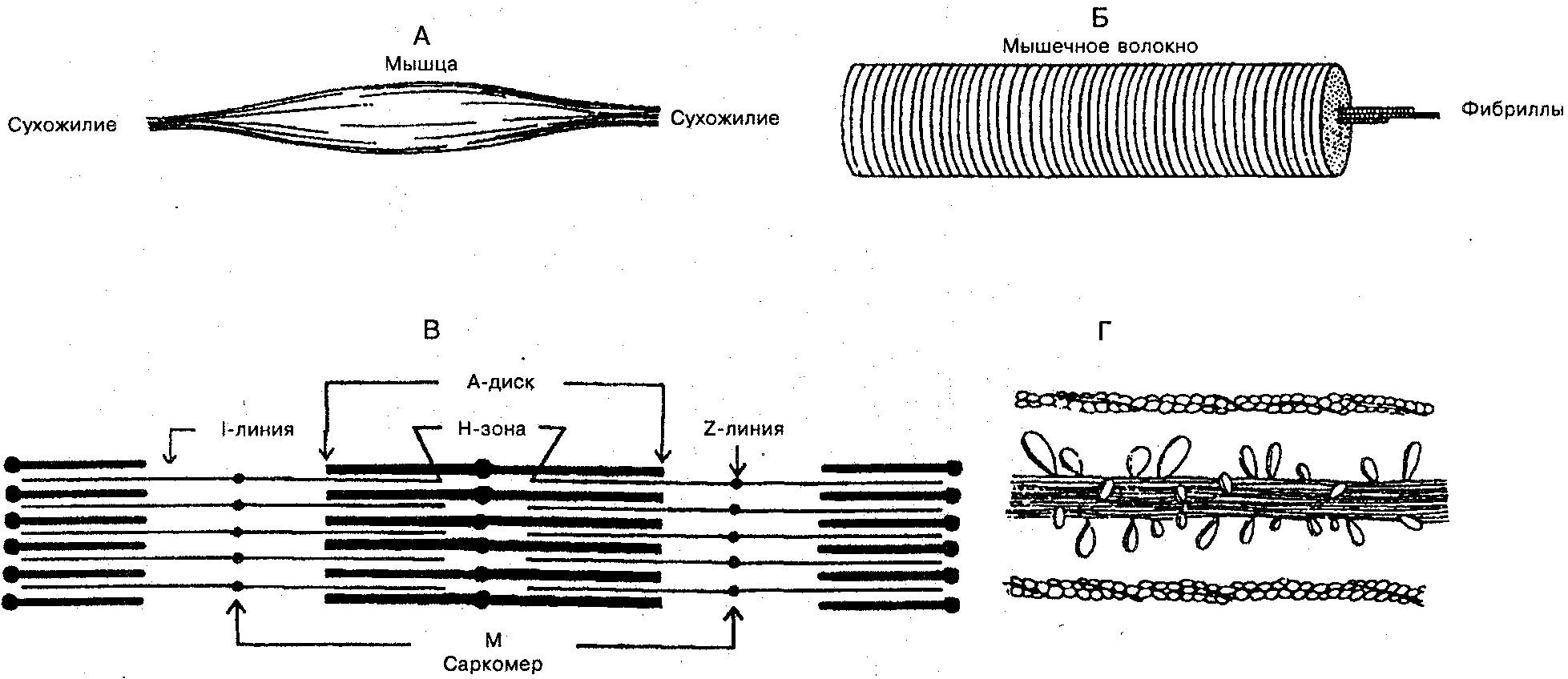 А — мышечные волокна прикреплены к сухожилиям; Б— отдельное волокно, состоящее из миофибрилл; В— отдельная мио-фибрилла: чередование светлых актиновых I-дисков и темных миозиновых А-дисков; наличие Н-зоны и М-линии; Г— поперечные мостики между толстыми миозиновыми и тонкими актиновыми нитями