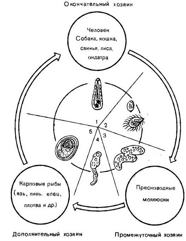 Описторх (от греч. opisthen – сзади и orchis – семенник, заднесеменниковый) паразитирует в желчных ходах печени, желчном пузыре и поджелудочной железе человека, собаки, кошки, свиньи и некоторых диких животных.