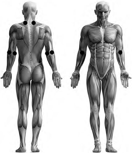 Чрескожная лазеротерапия данных заболеваний (основное воздействие производится на кожные проекции мыщелков локтевого сустава) с применением матричных лазерных аппаратов в течение 12–15 дней (мощность лазерного излучения – 30 мВт, частота импульсного лазерного излучения – 600 Гц, время экспозиции на 1 зону – по 10–15 мин – в зависимости от выраженности болевого синдрома) позволяет достичь хорошего клинического эффекта примерно в 41,3 % случаев. Дополнительно рекомендуется лазерное воздействие на области прикрепления трапециевидной мышцы у основания шеи, сосудисто-нервные сплетения области локтевой ямки (мощность лазерного излучения – 20 мВт, частота лазерного импульса – 150 Гц, время экспозиции на 1 зону – до 2 мин) (рис. 20).