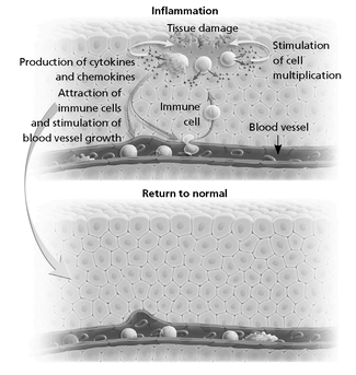 Рис. 3. Обычный воспалительный процесс. При повреждении ткани туда устремляются клетки иммунной системы. Они отслеживают и разрушают бактерии, а также стимулируют рост новых клеток и кровеносных сосудов, чтобы зарубцевать рану. Как только ткань восстановлена, процессы прекращаются.