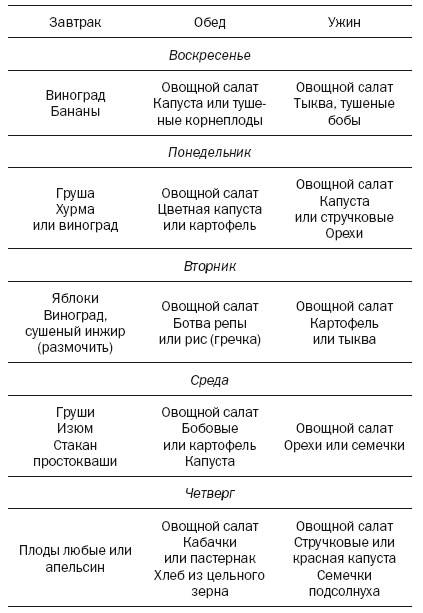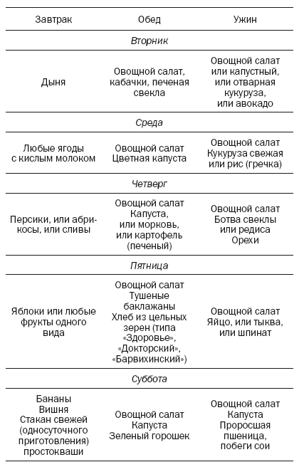 А вот меню еще проще: завтрак – фрукты, которые есть; обед – овощной салат и крахмальная пища (овощи или картофель и хлеб), ужин – овощи и белковая пища (один день – творог или сыр, другой день – орехи, или яйцо, или мясо и т. д.).