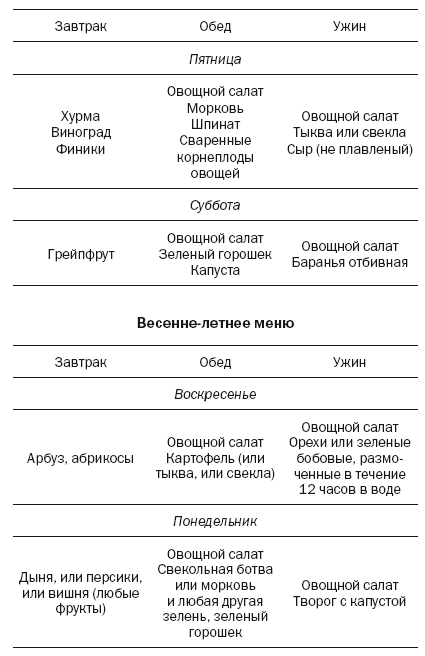 Представленная ниже схема питания на неделю (по Г. Шелтону) показывает правильное сочетание пищи в разные времена года. Она дана как основа для составления собственного меню.