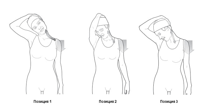 В первой позиции растяжения специально прорабатываются боковые участки шеи и верхняя часть плеча (верхняя порция трапециевидной мышцы, мышца, поднимающая лопатку, и кивательная мышца). Во второй и третьей позиции растяжения прорабатывается задний участок шеи, хотя в последней позиции в растяжении задействованы мышцы затылка и шеи, наиболее близкие к позвоночнику.