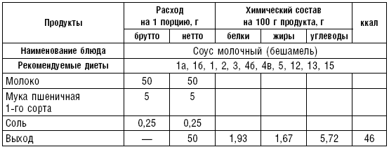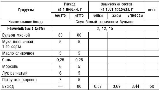 Для приготовления белых соусов муку подсушивают в жарочном шкафу без масла или поджаривают до светло-желтого цвета, затем заливают бульоном, овощным отваром или молоком, хорошо размешивают, чтобы не осталось комков, и процеживают. В соус можно добавить сок, образовавшийся после жарения мяса или птицы. Большинство соусов употребляют в горячем виде. Готовые горячие соусы хранят на мармите в закрытой посуде. В некоторых случаях вместо соуса в блюда добавляют масло, сметану или мясной бульон. Диетами № 2, 15 разрешается томатный соус из томатного сока на мясном бульоне, овощном отваре или на воде со сливочным маслом, сахаром или солью.