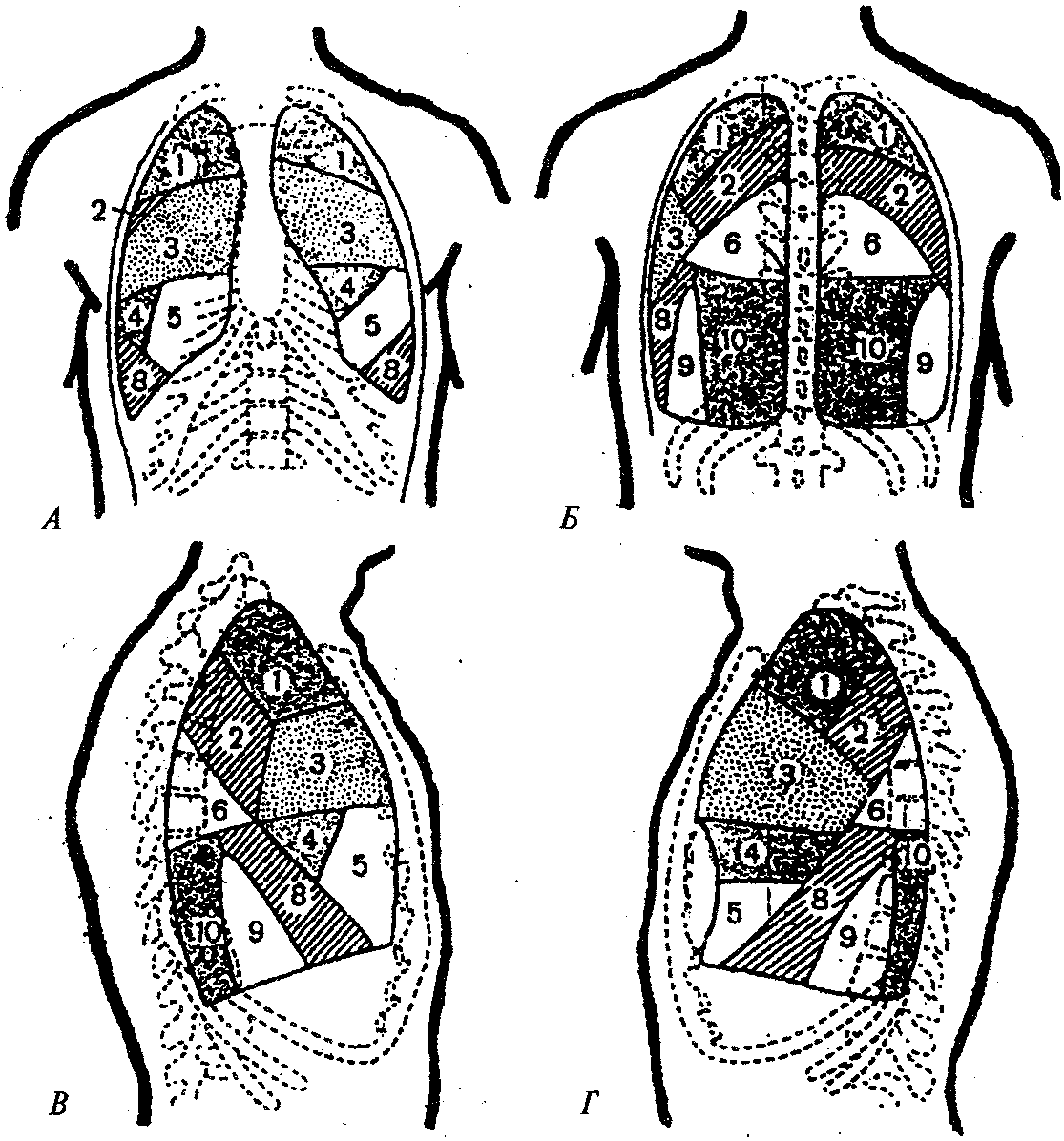 А — вид спереди; Б — вид сзади; В — правое легкое (вид сбоку); Г— левое легкое (вид сбоку)