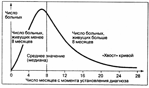 Испытывая волнение, Гульд начал искать в журналах наиболее полную кривую выживаемости при мезотелиоме. Наконец он нашел такую, на которой хвост распределения растягивался более чем на несколько лет. Таким образом, он убедился в том, что, даже если средний период выживания при мезотелиоме равняется восьми месяцам, некоторые люди живут с этой болезнью в течение многих лет. Гульд не видел причины, почему бы и ему не оказаться в числе этих счастливчиков, и он вздохнул с облегчением.