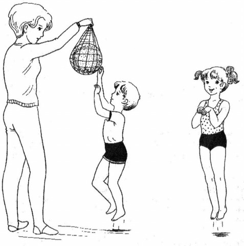 Начинать обучение прыжкам лучше с подпрыгивания на месте на двух ногах. Если отталкиваться от земли посильнее и носочками, а ноги выпрямлять, то прыжок будет выше. Приземляться нужно сначала на носочки, а потом уж на всю ступню. Развить эти навыки помогут упражнения — подпрыгивания до поднятой руки взрослого, до мяча, подвешенного на доступной высоте и несколько впереди (рис. 129), игры «Поймай комара» или «Позвони в колокольчик», «Мячики», «Зайчики» (рис. 130).