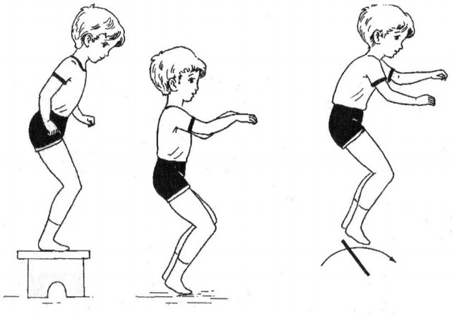 В 3–4 года уже умеют подпрыгивать на месте, прыгать в длину, слегка продвигаясь вперед и спрыгивать с небольшой высоты. Прыгают они еще очень неловко, тяжело, на всей ступне. Особенно неуверенно на прямые ноги и на всю ступню спрыгивают с высоты. Руки обычно в движении не участвуют.