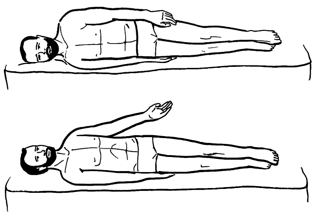 1. Диафрагмальное дыхание (с надуванием живота), руки должны быть сложены на груди и животе.