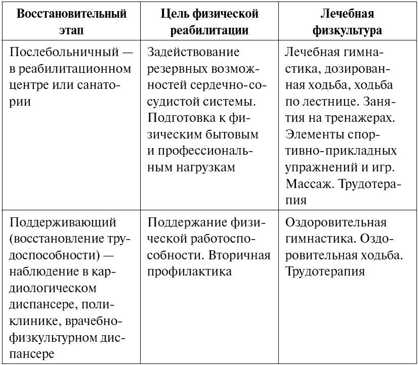 В таблице 5 приведены этапы физической реабилитации больных, перенесших инфаркт миокарда.