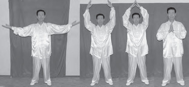 Поднять руки через стороны, представляя, что они уходят бесконечно далеко вверх и при этом собирают полезную энергию из Вселенной. Вверху ладони соединяются, после чего сложенные ладони начинают опускаться вниз. Когда ладони доходят до уровня третьего глаза, энергия Космоса входит через третий глаз и опускается вниз по позвоночнику в середину низа живота. При этом руки продолжают движение вниз перед грудью и как бы «ведут» энергию вдоль позвоночника.