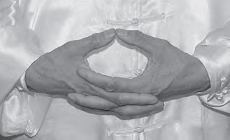 Дойдя до уровня живота, руки переплетаются в так называемый «замок спасения» (имеется в виду спасение от забот). Переплетенные пальцы рук (у мужчин левый указательный палец сверху, у женщин – наоборот) нужно остановить на уровне чуть ниже пупка, держа их на весу, не прикасаясь к животу, ладони под углом 45° к вертикали.