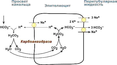 Ионы НСО3– транспортируются в кровь, ионы Н+ – секретируются в мочу в обмен на ионы Na+. Таким образом, объем реабсорбции НСО3– полностью соответствует секреции ионов Н+.