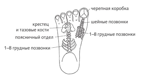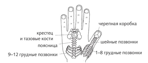 Техника начальной обработки (или разогрева) рефлексной зоны позвоночника и ребер на ладони предельно проста. Обхватываем массируемый большой палец другой рукой. Продольным движением вперед-назад большого пальца массирующей руки растираем всю рефлексную зону в трех проекциях (то есть по всей поверхности пальца), включая основание черепа (то есть сустав ногтевой фаланги). Затем хорошо выкручиваем и разминаем палец. И в завершение четырьмя пальцами массирующей руки растираем рефлексную зону на наружной стороне ладони.