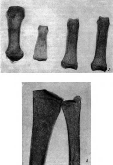 Рис. 117. А — резко выраженный деформирующий артроз в области основания I пястной кости, сохранение в ней и в основных фалангах поперечного тяжа; Б — поперечный тяж в адистальных метаэпифизах лучевой и локтевой костей.