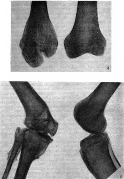 Рис. 119. А — костное срастание правого надколенника с бедренной костью; Б — порочное положение в коленном суставе в результате перенесенного перелома обеих берцовых костей и организовавшегося обширного кровоизлияния.