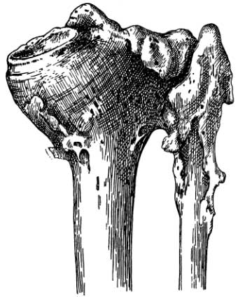 Надо полагать, что именно так возник подвывих в правом тазобедренном суставе у Ярослава (у которого в детстве был источник инфекции в ухе). Этот подвывих мог действительно в молодости мало мешать ратным подвигам Ярослава. У него было незначительное укорочение конечности, ибо подвывих кверху в известной мере компенсировался увеличением угла между шейкой и диафизом бедренной кости (рис. 118, Б).