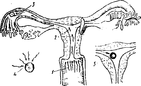 1— сперматозоиды, попавшие во влагалище во время полового сношения; 2—сперматозоиды, идущие через шеечный канал в полость матки; 3—сперматозоиды, находящиеся в трубе, вблизи яйцеклетки; 4— из многочисленных сперматозоидов только один оплодотворяет яйцеклетку; 5—благодаря сокращениям трубы, оплодотворенная яйцеклетка проникает в стенку матки (имплантация яйца).