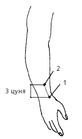 2. Пянь-ли («прохождение наискось) расположена на косой линии между запястьем и локтевым сгибом, на 3 цуня выше запястья (рис. 21).