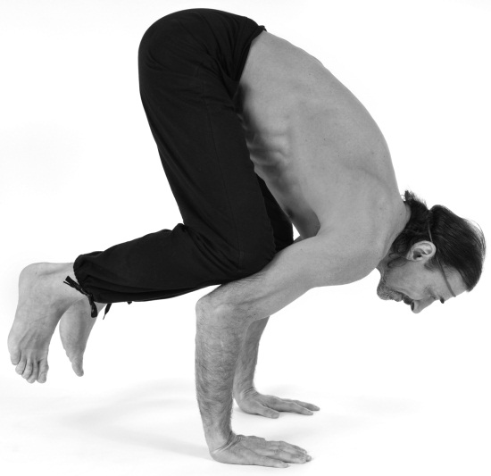 Удерживая таз приподнятым, осторожно сместите вес тела вперед и приподнимитесь на больших пальцах ног. Попробуйте зафиксировать центр тяжести тела на линии между ладонями — тогда стопы станут очень легкими.