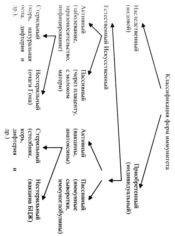 Иммунитет бывает наследственный (видовой) и приобретенный (индивидуальный). Приобретенный делится на естественный и искусственный, а каждый из них – на активный и пассивный и, в свою очередь, активный делится на стерильный и нестерильный (схема 1)