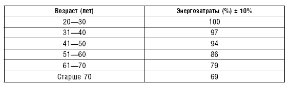 Интенсивность основного обмена и энергозатраты у пожилых и старых людей снижаются в прямом соответствии с увеличением возраста (табл. 93) за счет уменьшения мышечной массы тела, снижения физической активности и других процессов. Это ведет к закономерному снижению потребности в пищевых веществах и энергии. Согласно российским нормам рекомендуемая энергетическая ценность рациона составляет 1900–2000 ккал для женщин старше 60 лет и 2000–3000 ккал для мужчин того же возраста (табл. 94).