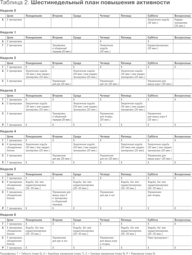 В таблице 2 аэробные тренировки предписано выполнять во вторник, четверг и субботу первой недели, но можно выбрать любые три дня. Обратите внимание, что тренировка в обеденный перерыв появляется во вторник первой недели; то есть она должна быть аэробной и выполняться активно. Во второй «аэробный» день выполните упражнения на гибкость после тренировок. Упражнения на статическую растяжку можно выполнять только на разогретые мышцы.